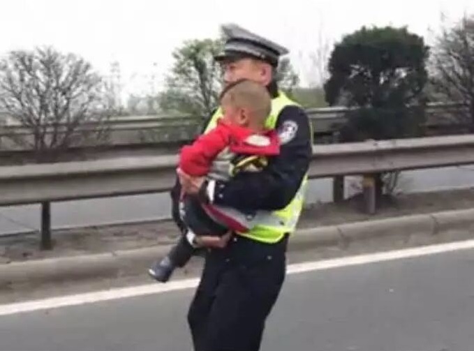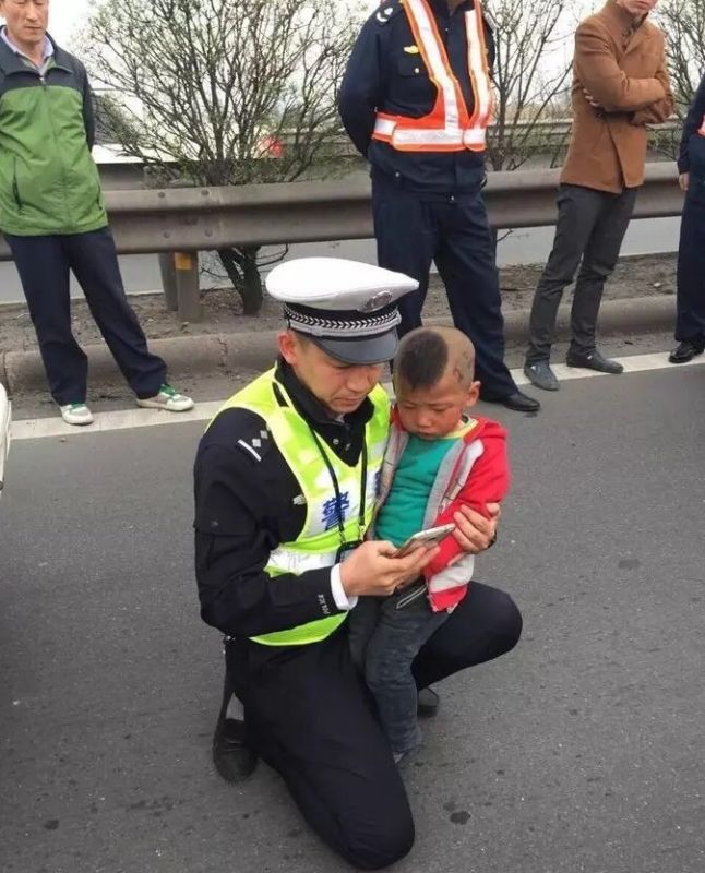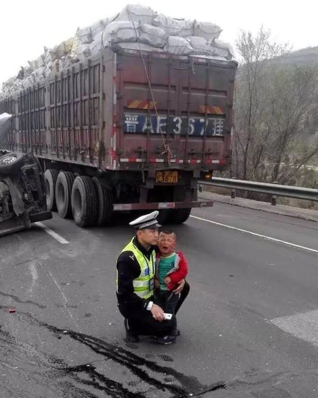 A police office was seen comforting and soothing a child who was in shock witnessing a car crash occurred to his family in highway in Taiyuan city, North China’s Shanxi province, on April 6, 2016.