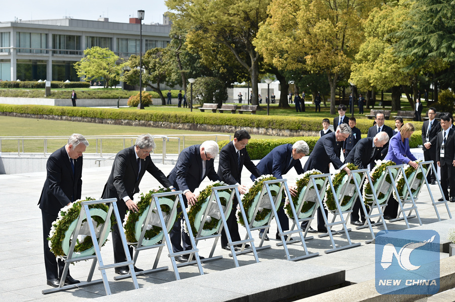 France's Foreign Minister Jean-Marc Ayrault, Italy's Foreign Minister Paolo Gentiloni, Germany's Foreign Minister Frank-Walter Steinmeier, Japan's Foreign Minister Fumio Kishida, U.S. Secretary of State John Kerry, Britain's Foreign Secretary Philip Hammond, Canada's Foreign Minister Stephane Dion and E.U. High Representative for Foreign Affairs Federica Mogherini carry wreath to offer in front of the cenotaph at Hiroshima Peace Memorial Park in Hiroshima on April 11, 2016. (Xinhua/POOL)