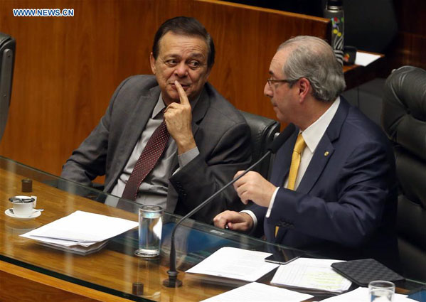 Chairman of Chamber of Deputies Eduardo Cunha (R) talks with Jovair Arantes during a session to discuss the impeachment process against Brazil's President Dilma Rousseff, in Brasilia, Brazil, on April 15, 2016. Brazil's Chamber of Deputies began on Friday a historical session with a vote on the continuity of the impeachment process against Dilma Rousseff. [Photo:Xinhua/AGENCIA ESTADO]