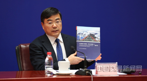 Liu Pengfei, spokesperson for China's Ministry of Transport, demonstrates the country's "Guidance on Arctic Navigation in the Northwest Route 2015" at a press conference on April 19, 2016. [Photo: zgjtb.com]