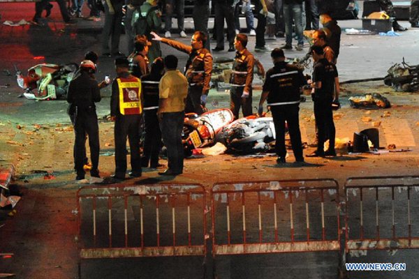 Thai policemen inspect the explosion site in Bangkok, Thailand, Aug. 17, 2015. (Photo/Xinhua)
