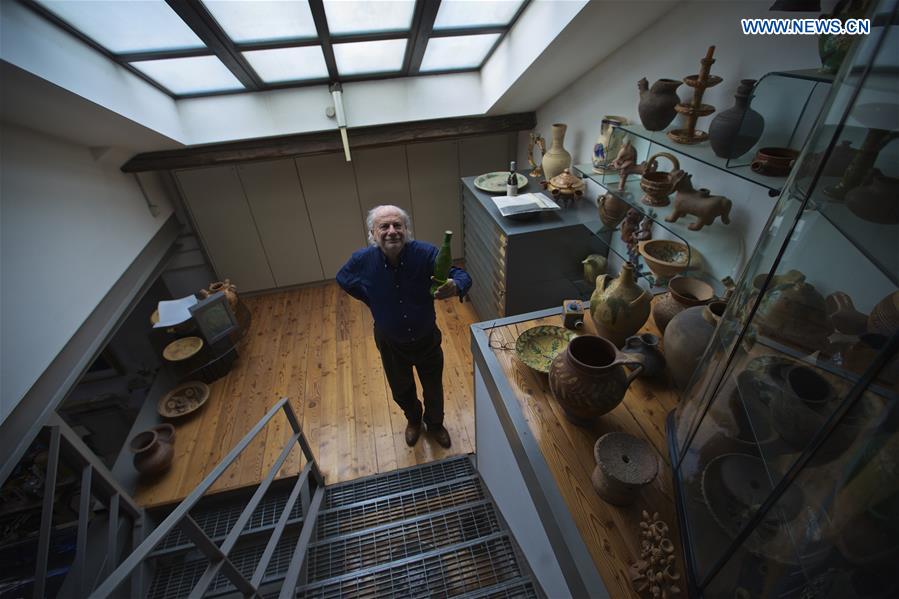 MILAN, April 25, 2016 -- Mariani presents his first design piece for a wine company at his home and studio in Milan, Italy, on April 13, 2016. Italian artist Umberto Mariani lives and works at a loft in a former factory in Milan. Mariani, who will turn 80 at the end of this year, is best known for his multidimensional folds of fabric carved out of lead sheets. During the 1960s, Mariani picked up his first projects doing monumental narrative work for the St. Peter's Basilica in Vatican City as well as mosaics and frescos, but the classical Greek statues that he grew up observing on the streets of Italy had the most profound influences on his work. "In 1974, I started to make paintings where the fold and drapery were the absolute protagonists," he told Xinhua. "If you thumb through an art history book, you will see that drapery takes 80 percent of the painted or sculptured surfaces." By the 1990s he gave up painting, and up to now in his laboratory new ideas, shapes and colors come out incessantly from lead. He underlined that true artworks require study besides passion. The advice that he gives young artists is not to wait for inspiration, as all the best ideas come out of the work itself. "This is how things went for all the great artists of the past, whose masterpieces such as The Last Supper by Leonardo da Vinci, just to make an example, were often made on commission and resulted from deep commitment," he said. (Xinhua/Jin Yu)