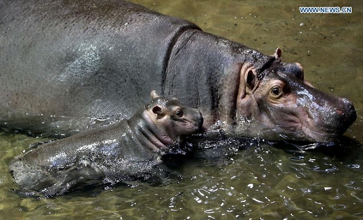A hippo cub stays with its mother at Shanghai Zoo, Shanghai, east China, April 27, 2016. Shanghai Zoo greeted newborn animals recently, with a black-backed jackal giving birth to a quintuplets and a hippo giving birth to a cub.