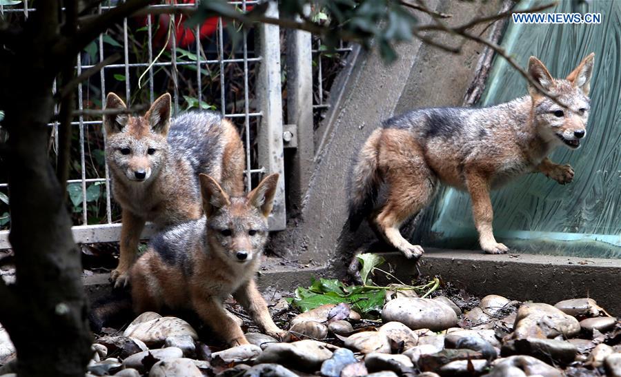 Black-backed jackal cubs frolic at Shanghai Zoo, Shanghai, east China, April 27, 2016. Shanghai Zoo greeted newborn animals recently, with a black-backed jackal giving birth to a quintuplets and a hippo giving birth to a cub.