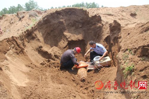 A bomb over 1 meter long is excavated from a construction site in Tancheng county in east China's Shandong province on May 8.(Photo/qlwb.com.cn)