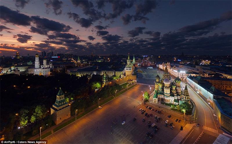 The streets of the Kremlin in Moscow look almost completely deserted in this image. In the background, parts of the city is cast in complete darkness