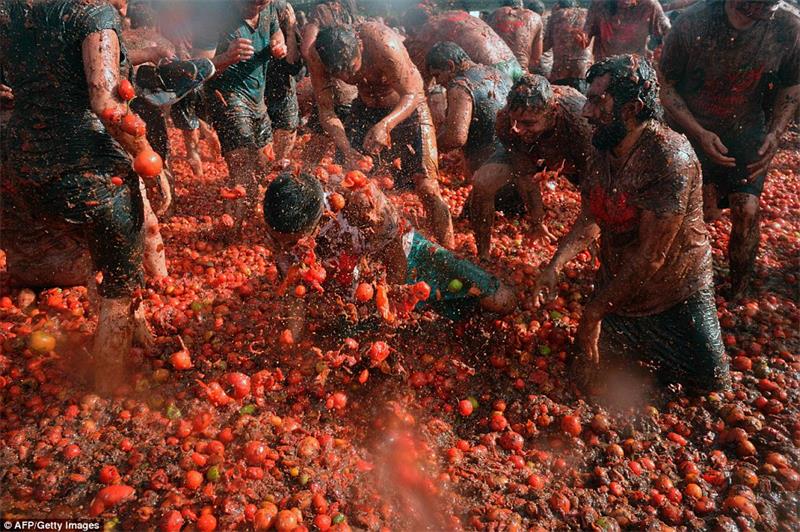 Images show thousands of people laughing and crouching as they hurl millions of the overripe fruit at one another