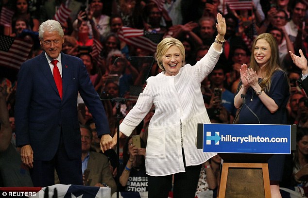 V is for Victory: Bill, Hillary and Chelsea are seen here after Clinton's rally in Brooklyn, near her national campaign headquarters.