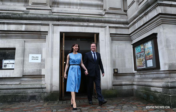 Britain's Prime Minister, David Cameron and his wife Samantha leave the Central Methodist Hall polling station after casting their votes for the EU Referendum in London, on June 23, 2016. Millions of Britons will vote to stay in or leave the European Union (EU) on Thursday as polling stations across the country opened to the public in the morning. [Photo: Xinhua]
