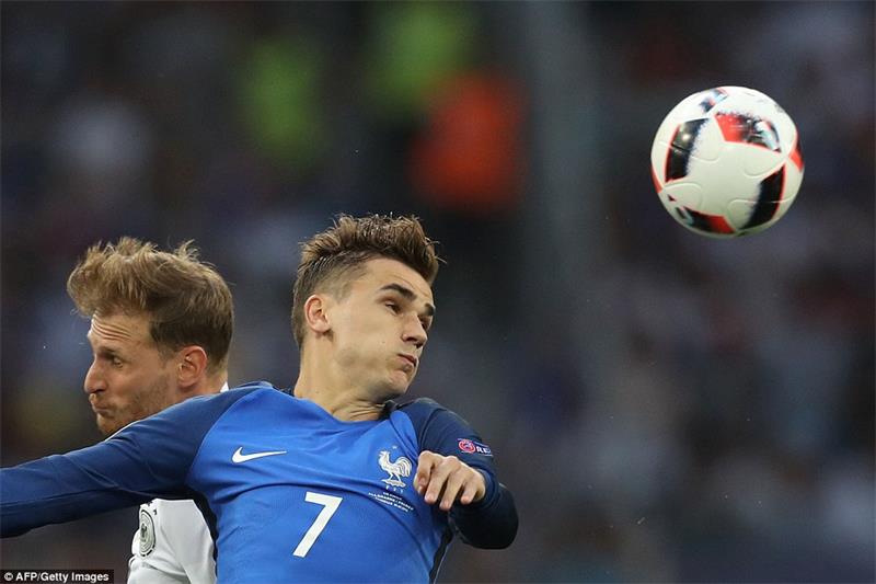 Griezmann leaps to head the ball as the host nation made a bright start to proceedings on the south coast of France