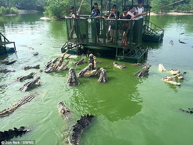 Jon Nok, a passing motorcycle-taxi driver took the photos of the tourists surrounded by hundreds of hungry crocodiles.