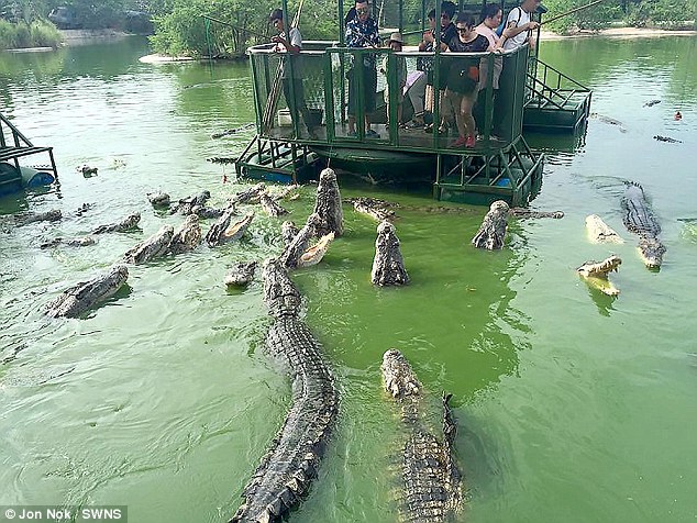 Jon Nok, a passing motorcycle-taxi driver took the photos of the tourists surrounded by hundreds of hungry crocodiles (pictured)