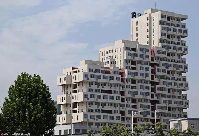 Photos taken on July 20, 2016, show three residential buildings in a row in Zhengzhou, central China’s Henan province. The buildings look like they were piled up by Tetris clumps into irregular shapes.