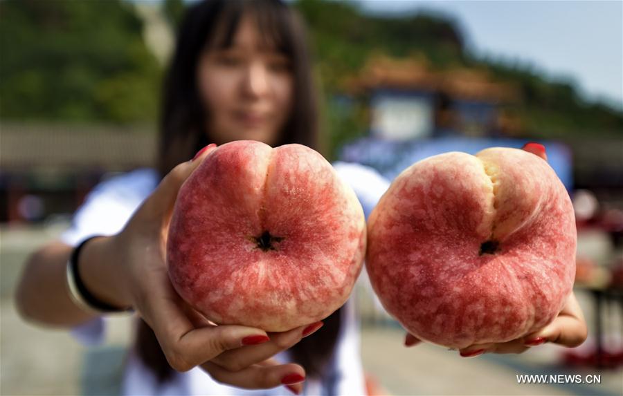 A staff worker of an e-commerce shop shows newly-picked peaches during a peach fair in Liujiadian Township of Pinggu District in Beijing, capital of China, July 28, 2016. More than 100 species of peaches were displayed at the activity on Thursday. The planting area of peaches in Liujiadian has reached 1,200 hectares, with output of 35,000 tons. (Xinhua/Li Xin)