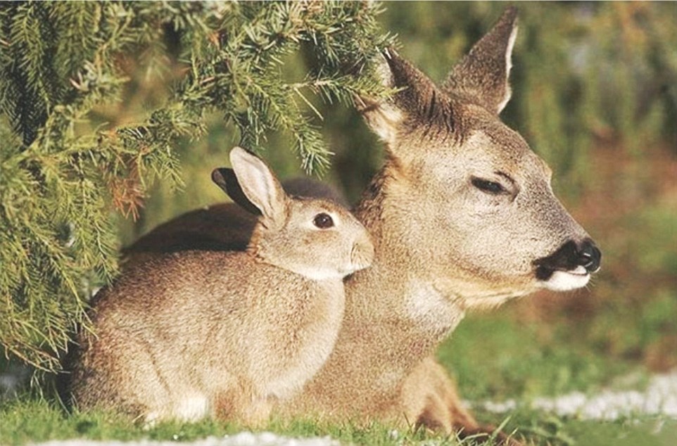 What a 'deer' little pair: A brown rabbit and a matching fawn soak up the sunshine