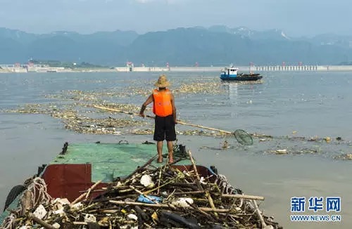 An enormous patch of floating garbage was seen at the Three Gorges Dam near the Yichang section in Central China’s Hubei province on July 28, 2016.