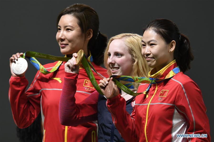 Virginia Thrasher (C) of the United States, Du Li (L) and Yi Siling of China attend the awarding ceremony of the Women's 10m Air Rifle of shooting of the 2016 Rio Olympic Games at the Olympic Shooting Centre in Rio de Janeiro, Brazil, on Aug. 6, 2016. (Xinhua/Qi Heng)