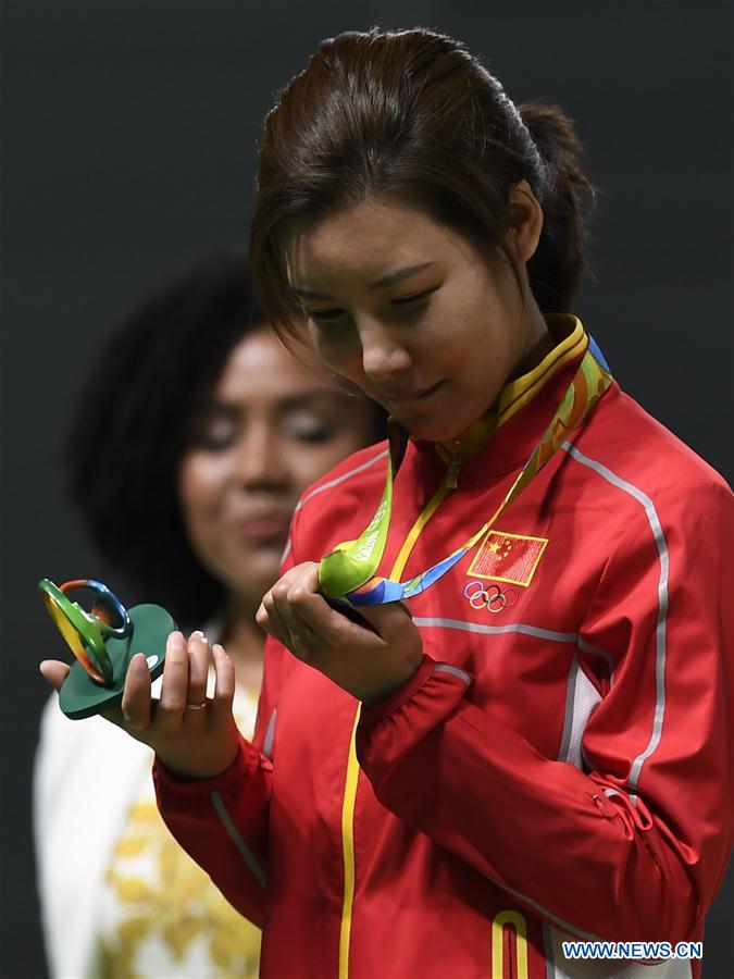 Du Li of China looks her silver medal at the awarding ceremony of the Women's 10m Air Rifle Finals competition of the 2016 Rio Olympic Games at the Olympic Shooting Centre in Rio de Janeiro, Brazil, on Aug. 6, 2016. (Xinhua/Qi Heng)