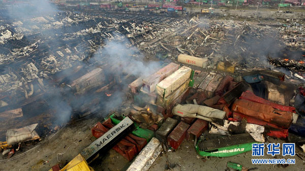 An aerial photo taken on Aug. 15, 2015 shows the core area of explosion site in Tianjin's Binhai New Area, north China. [Photo: Xinhua]