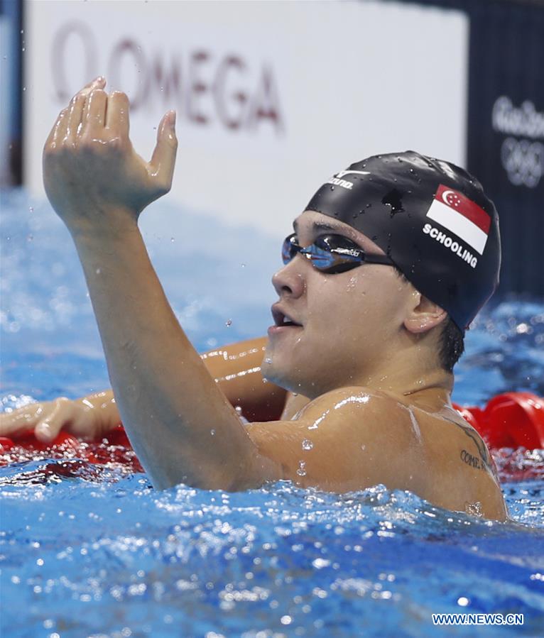 Joseph Schooling of Singapore celebrates after the men's 100m butterfly final at the 2016 Rio Olympic Games in Rio de Janeiro, Brazil, on Aug. 12, 2016. Joseph Schooling won the gold medal. (Xinhua/Qi Heng)