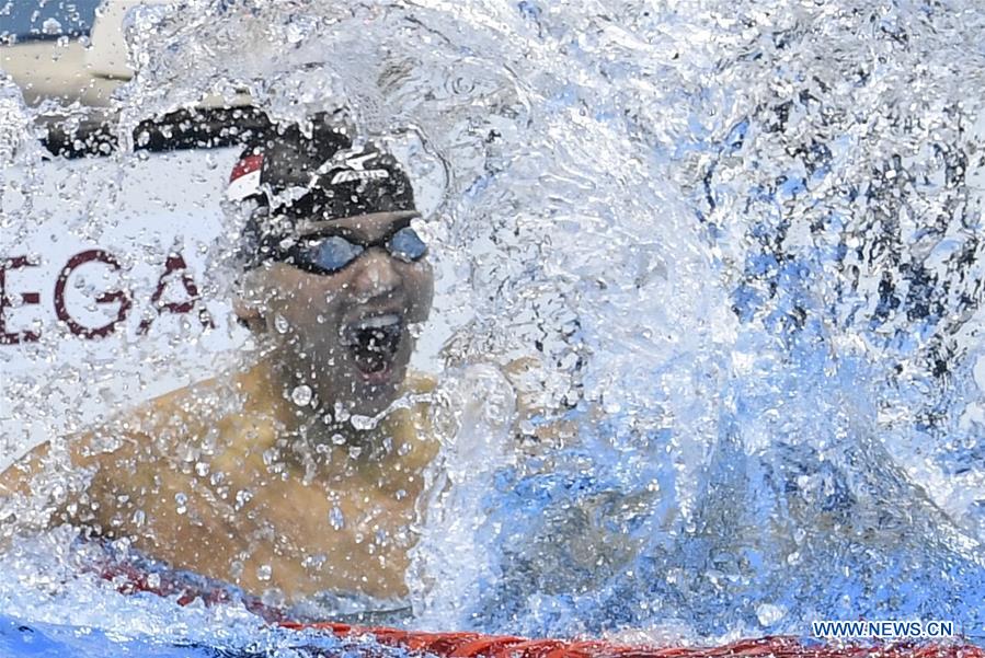 Joseph Schooling of Singapore celebrates after the men's 100m butterfly final at the 2016 Rio Olympic Games in Rio de Janeiro, Brazil, on Aug. 12, 2016. Joseph Schooling won the gold medal. (Xinhua/Fei Maohua)