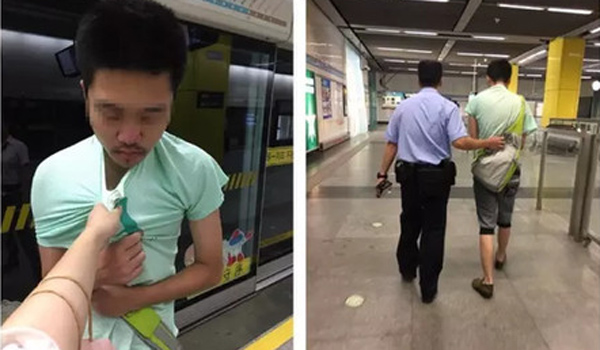 When the subway stopped at Songjiang New City Station, Xiao dragged the man off the train and called police from the station. She kept a tight grip on the man's collar with one hand while she took photos of him with the phone in her other.