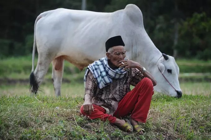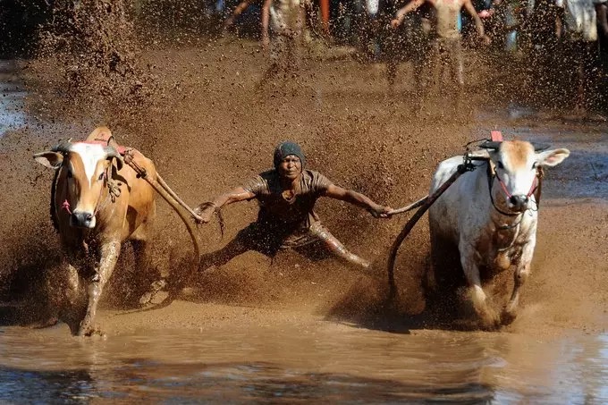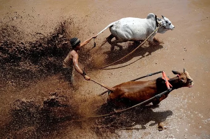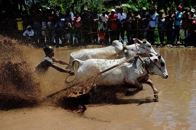 Photos taken on August 14, 2016, show the traditional annual Pacu Jawi bull race near Padang, Indonesia. The charging bulls raced across water, making splashes wherever they go.