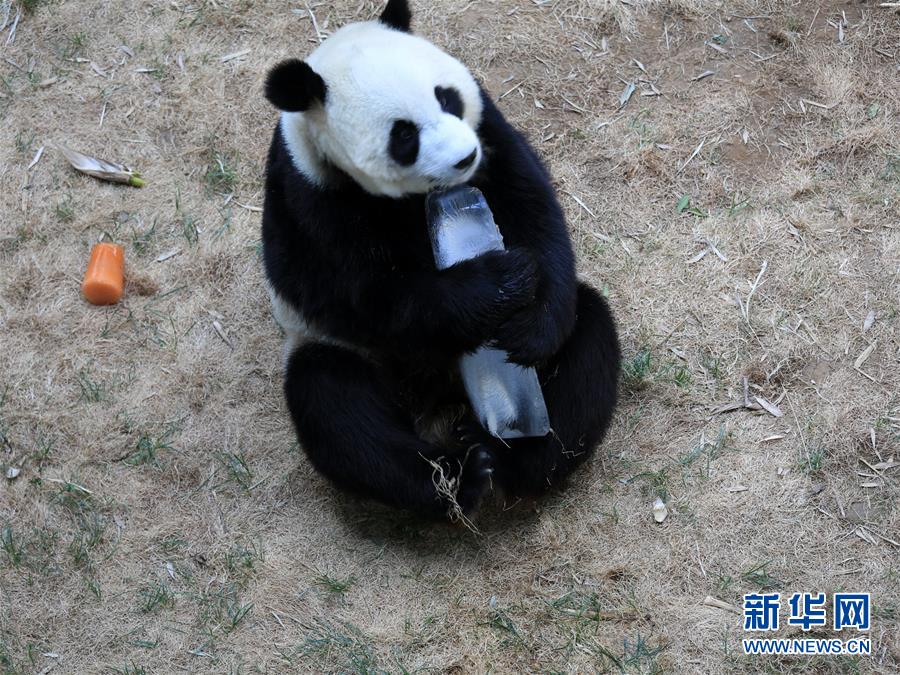 A panda embraces an ice block at Dalian Forest Zoo in northeast China’s Dalian province, Aug. 16, 2016.[Photo/News.cn]