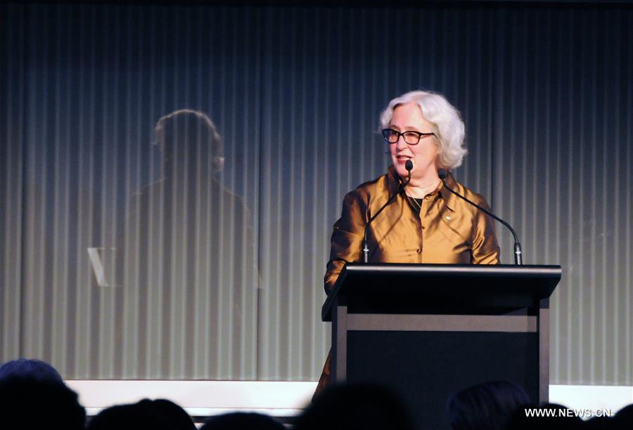 Patricia Aldana, president of the Hans Christian Andersen Award jury, addresses during the awarding ceremony of the Hans Christian Andersen Award in Auckland, New Zealand, Aug. 20, 2016. Cao Wenxuan, one of China's most popular authors of children's fictions, received the Hans Christian Andersen Award here on Saturday, becoming the first Chinese writer for the most distinguished international honor for children's literature. (Xinhua/Tian Ye)