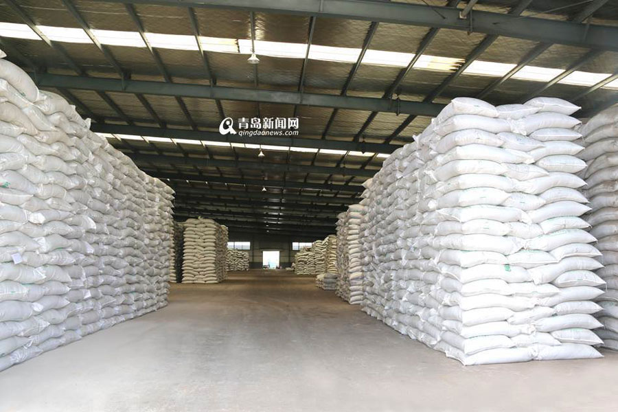 Processed enteromorpha seaweed powder stored in a warehouse in Qingdao, east China's Shandong province. [Photo: qingdaonews.com]