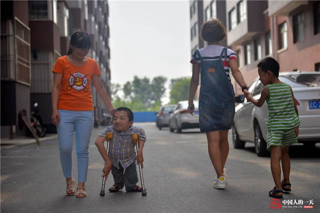 Dong Zhijun, 29, was born with congenital rachitis, which hampered the development of his limbs as he grew up. As an adult, he never grew taller than 80 centimeters. He spent the majority of his childhood and teenage years in bed, though he is now able to walk with crutches.