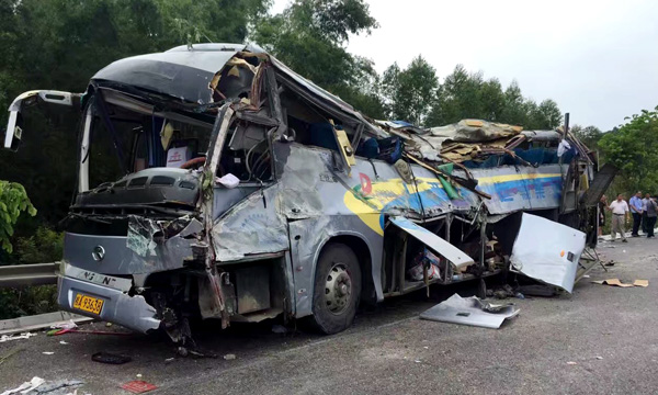 The damaged bus was pulled to the side of the highway after the accident.[Photo/CHINA DAILY]
