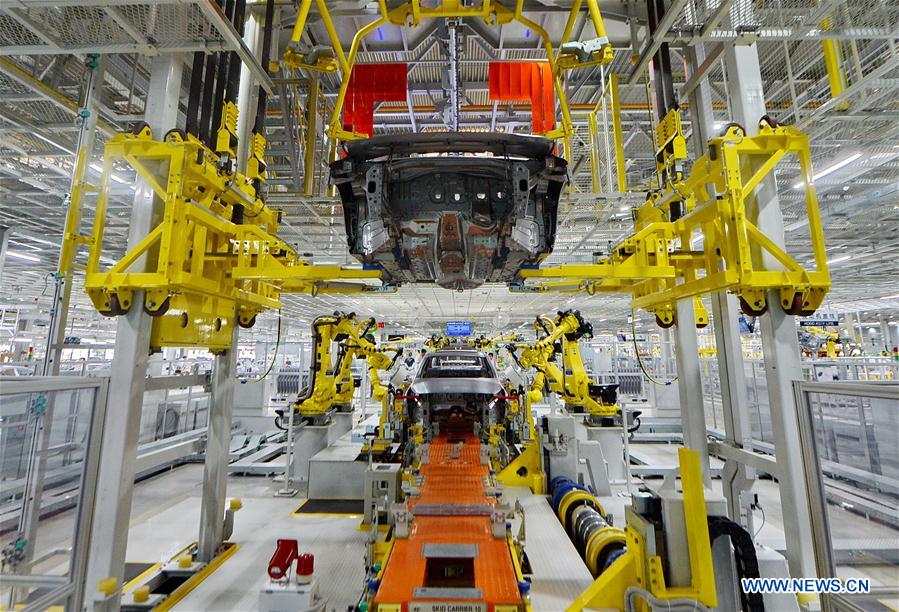 Photo taken on Sept. 8, 2016 shows the welding production line at Beijing Hyundai plant in Cangzhou, north China's Hebei Province. The Cangzhou plant is expected to operate in October 2016, with a production capacity of 300,000 vehicles and 200,000 engines per year. (Xinhua/Mou Yu)