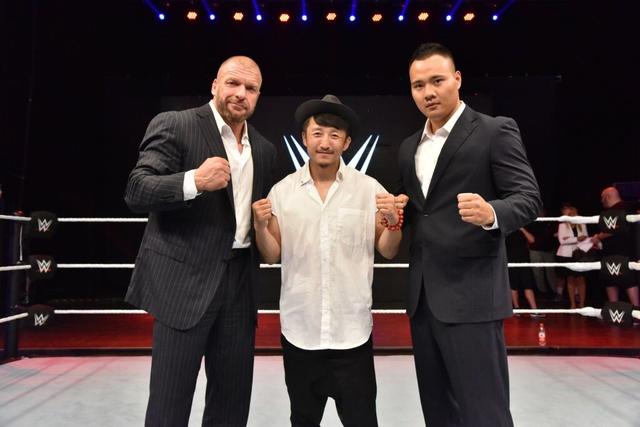 File photo: WWE Paul Levesque (L), Executive Vice President of WWE posed with Chinese boxing champion Zou Shiming (M) and Wang Bin (R) the first Chinese wrestler they have signed.