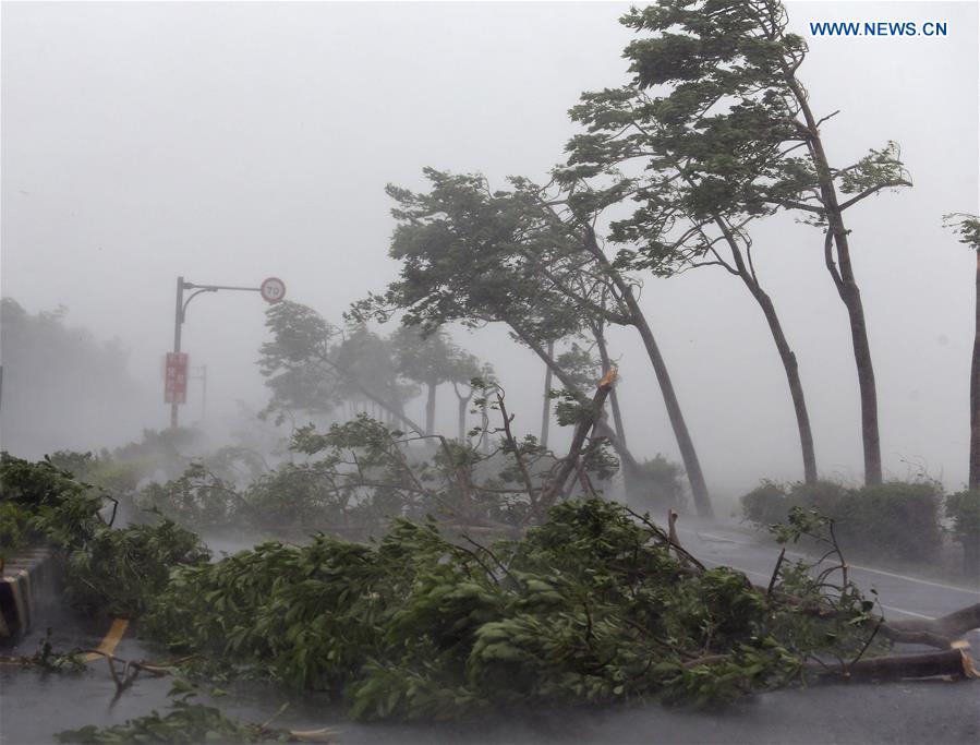 Trees are broken by strong wind on a highway from Pingtung to Kenting in typhoon-hit Taiwan, southeast China, Sept. 14, 2016. Typhoon Meranti on Wednesday brought strong winds and heavy downpour to the island. (Xinhua)