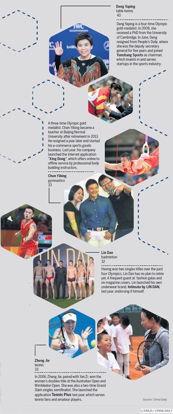 According to Tan Jianxiang, a sports sociology professor at South China Normal University, the rapid growth of the sports industry offers a great opportunity for the athletes to turn their experience and fame into business success, especially for those who don't want to spend the rest of their lives in bureaucracy.
