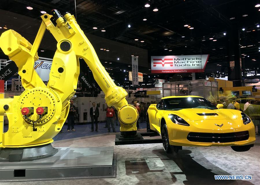 Photo taken by smartphone on Sept. 14, 2016 shows arm of industrial robots holding a sports car on the exhibition in Chicago, the United States. The International Manufacturing Technology Show is one of the largest industrial trade shows in the world, featuring more than 2000 exhibiting companies and 114,147 registrants. It is held from Sept. 12 to 17 at McCormick Place in Chicago. (Xinhua/Wang Ping)