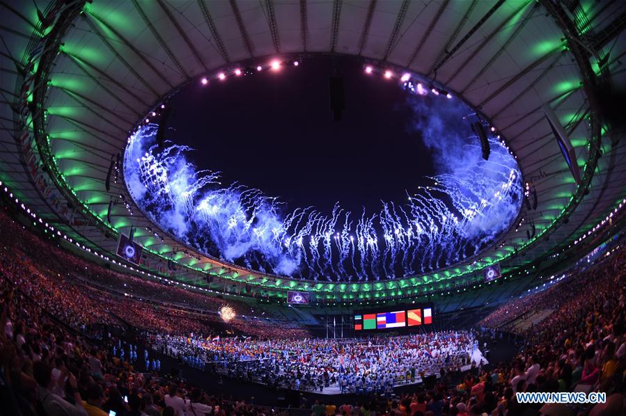 Photo taken on Sept. 18, 2016 shows the fireworks of the closing ceremony of Rio 2016 Paralympic Games at Maracana Stadium in Rio de Janeiro, Brazil. [Photo: Xinhua]
