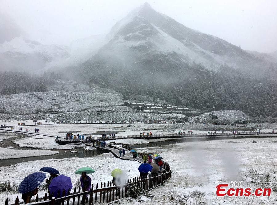 Visitors enjoy view of snow at Daocheng Yading scenic spot in Ganzi Tibetan Autonomous Prefecture of southwest China’s Sichuan province on September 20, 2016. Affected by the cold spell, the region sees snow in recent days. Daocheng Yading scenic spot is constituted by snow mountains, rivers, lakes and alpine meadow. Unique landscape and original natural beauty make the place a fairyland. (Photo: China News Service/ Zhong Xin)