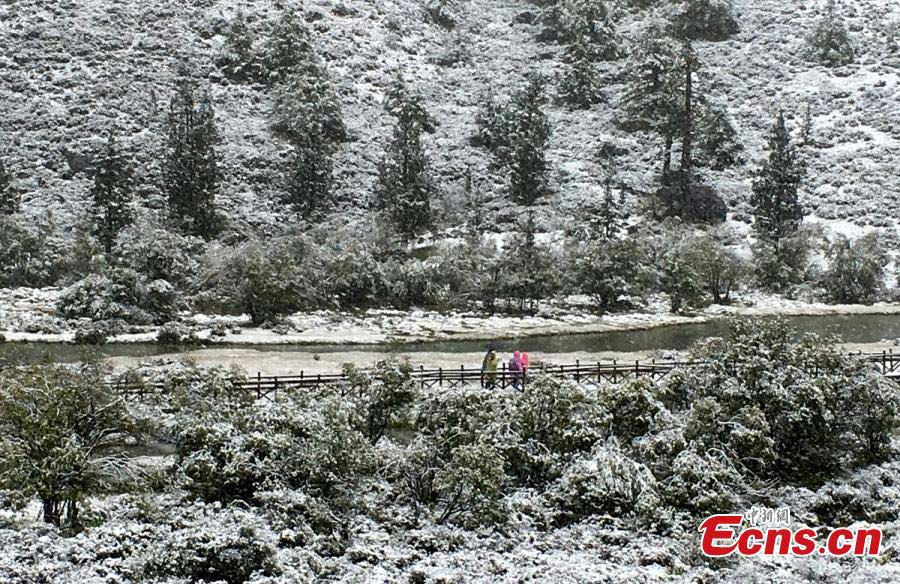 Visitors enjoy view of snow at Daocheng Yading scenic spot in Ganzi Tibetan Autonomous Prefecture of southwest China’s Sichuan province on September 20, 2016. Affected by the cold spell, the region sees snow in recent days. Daocheng Yading scenic spot is constituted by snow mountains, rivers, lakes and alpine meadow. Unique landscape and original natural beauty make the place a fairyland. (Photo: China News Service/ Zhong Xin)