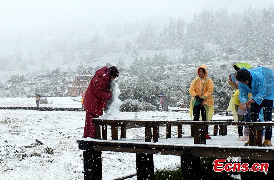 Visitors enjoy view of snow at Daocheng Yading scenic spot in Ganzi Tibetan Autonomous Prefecture of southwest China’s Sichuan province on September 20, 2016. Affected by the cold spell, the region sees snow in recent days. Daocheng Yading scenic spot is constituted by snow mountains, rivers, lakes and alpine meadow. Unique landscape and original natural beauty make the place a fairyland. (Photo: China News Service/ Zhong Xin)