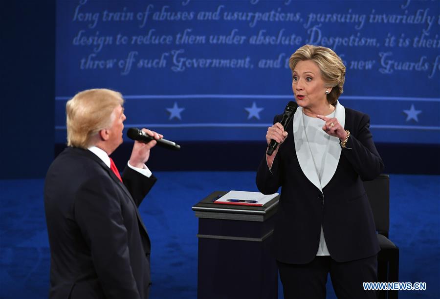 Democratic presidential candidate Hillary Clinton (R) and Republican presidential candidate Donald Trump hold the second presidential debate at Washington University in St. Louis, Missouri, the United States, Oct. 9, 2016. (Xinhua/Yin Bogu)