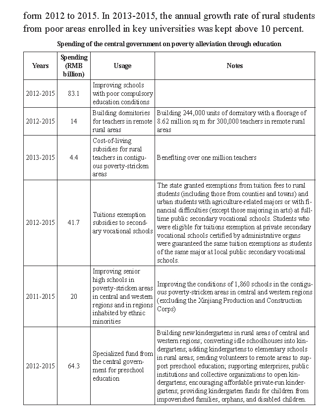 In 2012-2015, the central government injected RMB83.1 billion into poor compulsory education schools, and RMB14 billion to build 244,000 dormitory units for 300,000 teachers in remote rural areas. The state carried out a three-year action plan to promote preschool education, increasing the nation's three-year preschool gross enrollment rate from 62.3 percent in 2011 to 75 percent in 2015. In central and western China, the number of children enrolled in kindergartens rose from 21.53 million in 2011 to 27.89 million in 2015, up 30 percent. Following the release of the Notice on Unifying the Establishment of the Faculty and Staff of Elementary and Secondary Schools in Urban and Rural Areas, issued in November 2014, the teaching and administrative staff of elementary and secondary schools in villages, counties, and towns began to enjoy the same standards of establishment as urban schools, with favorable treatment for those in remote poor rural areas. In 2013-2015, the central government allotted RMB4.4 billion for cost-of-living subsidies for rural teachers in contiguous poverty-stricken areas, benefiting over one million teachers in 600 counties. In 2012-2015, the central government provided RMB41.7 billion in tuition subsidies to secondary vocational schools, and granted exemptions from tuition fees to rural students (including those from counties and towns) and urban students with agriculture-related majors or with financial difficulties (except those majoring in arts) at full-time public secondary vocational schools. Students who were eligible for tuitions exemption at private secondary vocational schools certified by administrative organs were guaranteed the same tuition exemptions as students of the same major at local public secondary vocational schools. The state offers grants to first- and second-year students with agriculture- related majors or with financial difficulties at full-time schools, and the standard has been raised from RMB1,500 per student per year in 2012-2014 to RMB2,000 since the spring semester of 2015, covering 40 percent of students. A directional enrollment program was carried out in poverty-stricken areas, enrolling 183,000 students in 832 impoverished counties form 2012 to 2015. In 2013-2015, the annual growth rate of rural students from poor areas enrolled in key universities was kept above 10 percent.