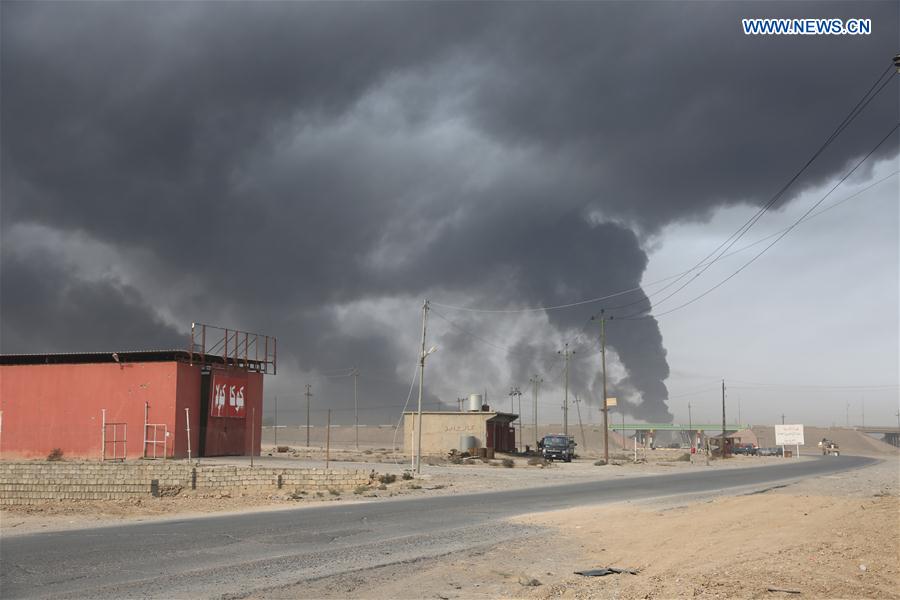 Photo taken on Oct. 17, 2016 shows the heavy smoke rising from oil wells which were destroyed by the Islamic State militants in Qayyarah, southern Mosul, Iraq. Iraqi Prime Minister Haider al-Abadi announced early Monday the beginning of a major offensive to retake the second largest Iraqi city of Mosul from the Islamic State (IS) group. (Xinhua/Liu Wanli)