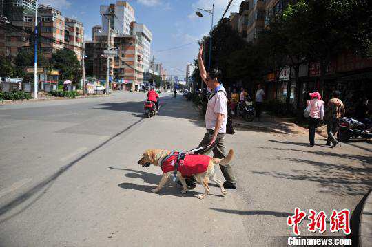The first guide dog in Kunming, Yunnan province has been working for its master, Peng Bin, for 40 days. After being featured in numerous local media reports, the dog, nicknamed Panghu, has become something of a local celebrity.