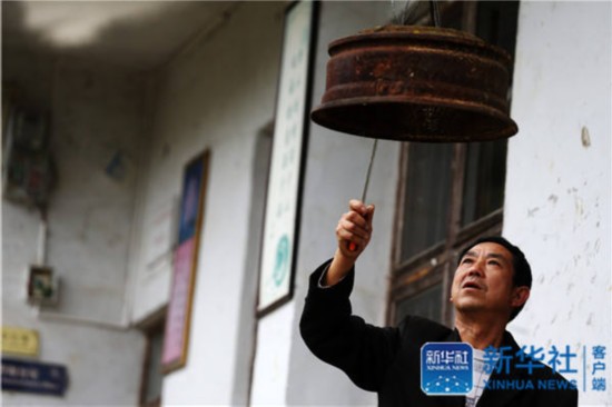 Yang Jinhua, the only teacher in Muqiao primary school, hits the clock made from a car tire on October 24, 2016. [Photo: Xinhua]