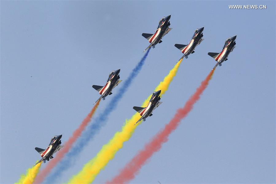 J-10 fighter jets of China's Bayi Aerobatic Team perform at the 11th China International Aviation and Aerospace Exhibition in Zhuhai, south China's Guangdong Province, Nov. 1, 2016. (Xinhua/Li Gang)