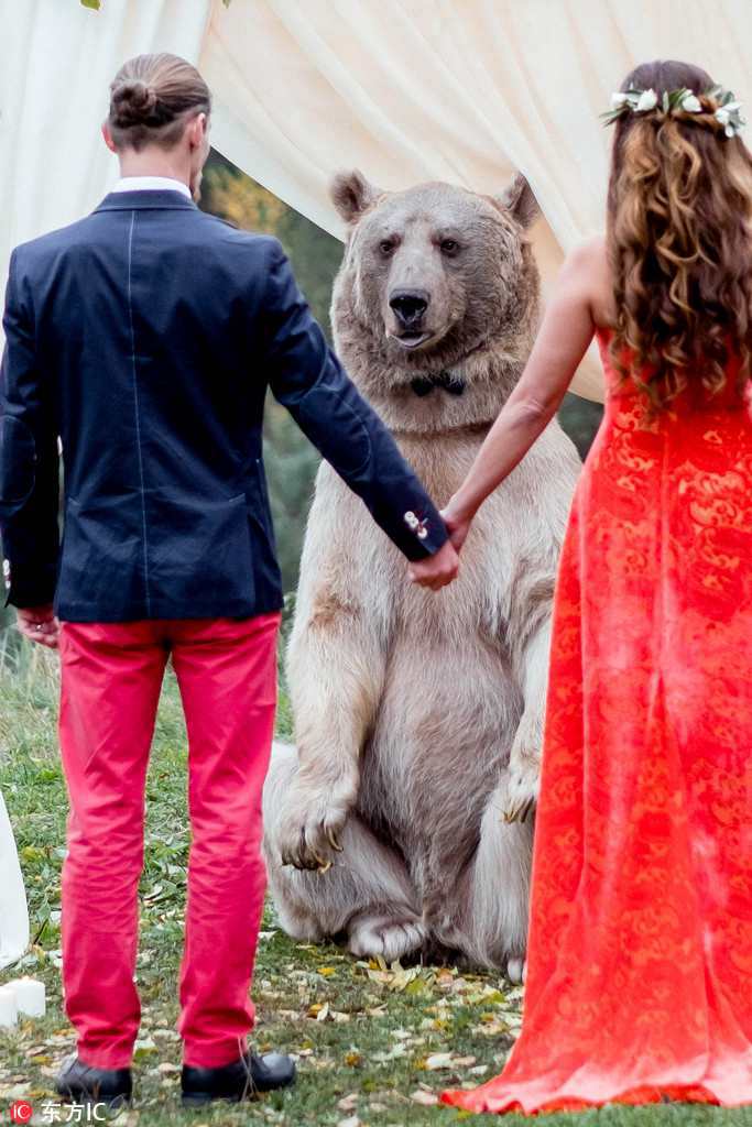 A couple in Moscow had an unusual special guest at their wedding ceremony. The bride and groom invited a brown bear named Stepan to witness their exchange of vows, and even took a picture with the furry guest during the ceremony. (Photo / People’s Daily Online)