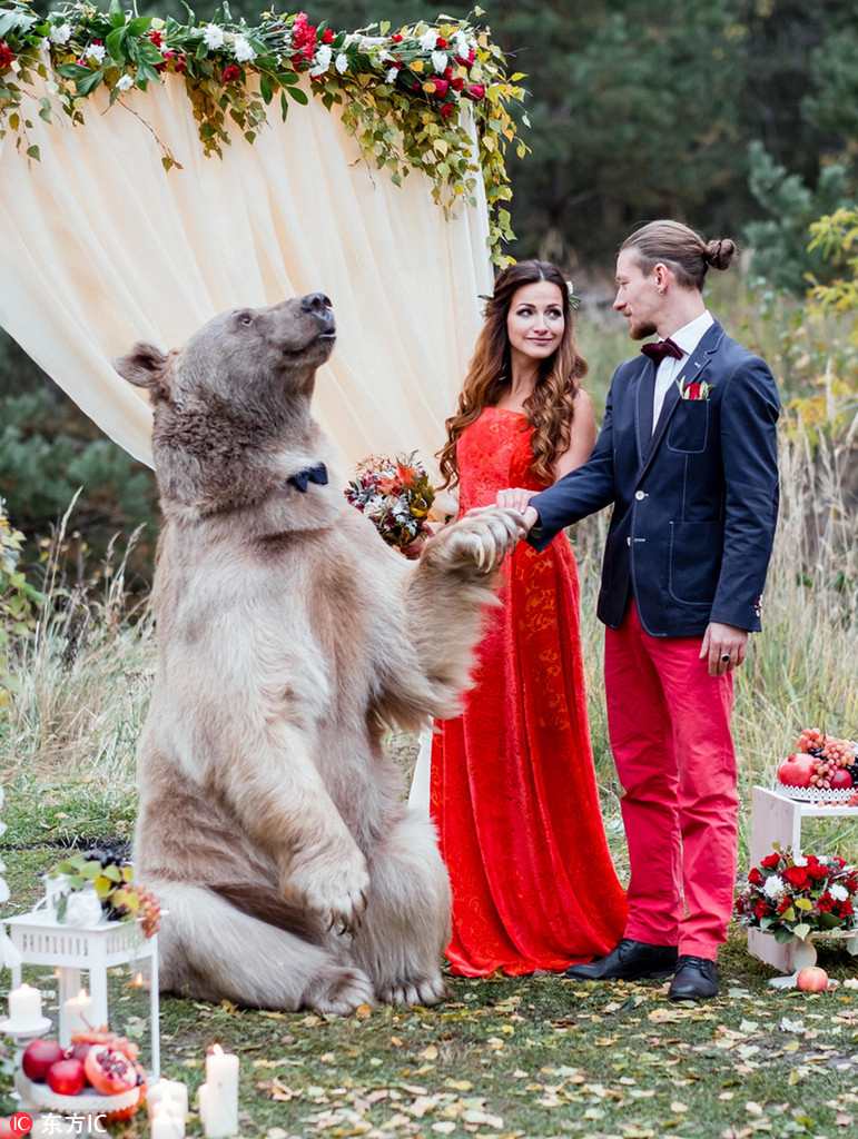 A couple in Moscow had an unusual special guest at their wedding ceremony. The bride and groom invited a brown bear named Stepan to witness their exchange of vows, and even took a picture with the furry guest during the ceremony. (Photo / People’s Daily Online)