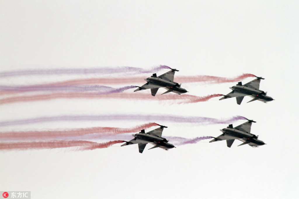 The 11th China International Aviation and Aerospace Exhibition soared over Zhuhai on Nov. 1, offering audiences an awe-inspiring show featuring performances by the Bayi (August 1st) Aerobatics Team of the PLA. The team has amazed various audiences with its delicate and complicated performance. Aerial aerobatics teams from Russia, Britain and Pakistan also wooed spectators, with Britain's Red Arrows giving their first ever performance at the air show. (Photo / People’s Daily)